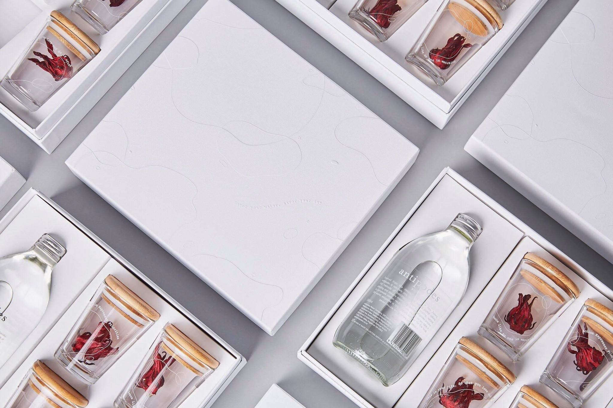 最後經由PiliWu Design整體設計的巧思,杯中放入台東農地自產洛神花,自然烘乾而成的豔紅花朵,於透明玻璃杯中精巧綻放。 四杯花一瓶水的組合,也讓收禮人體會以台東在地的純粹美好。