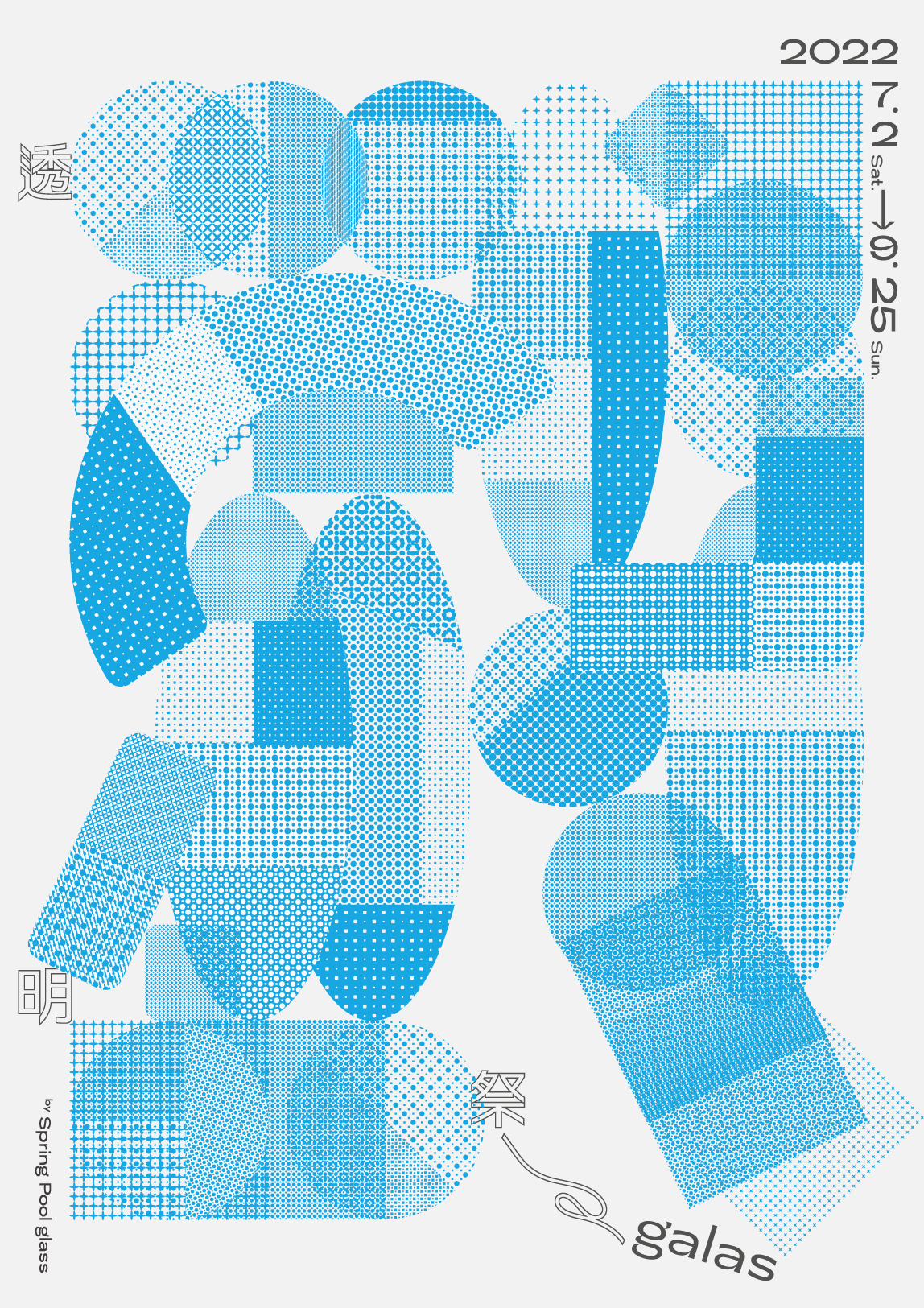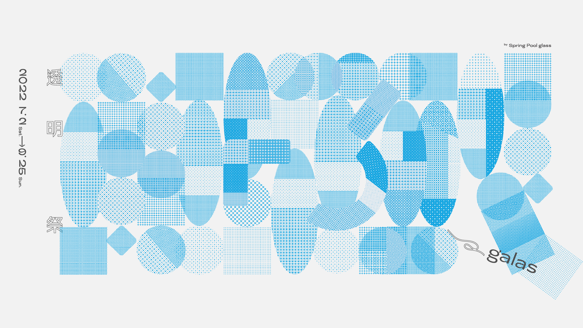 主視覺延續春池量子設計概念,分解閱讀玻璃的平面設計,本次透明祭__Galas主視覺設計,春池再次攜手究方社藉由平面設計傳遞玻璃多種樣貌,透過不同的網點交錯、並置,產生同一種顏色深淺不同的變化,形同變化中的玻璃色料,再使用圓形、矩形、橢圓等形狀進行組合,象徵城市中不同關係的緊密連結,最後將透明風鈴放入透明祭的主視覺設計概念。