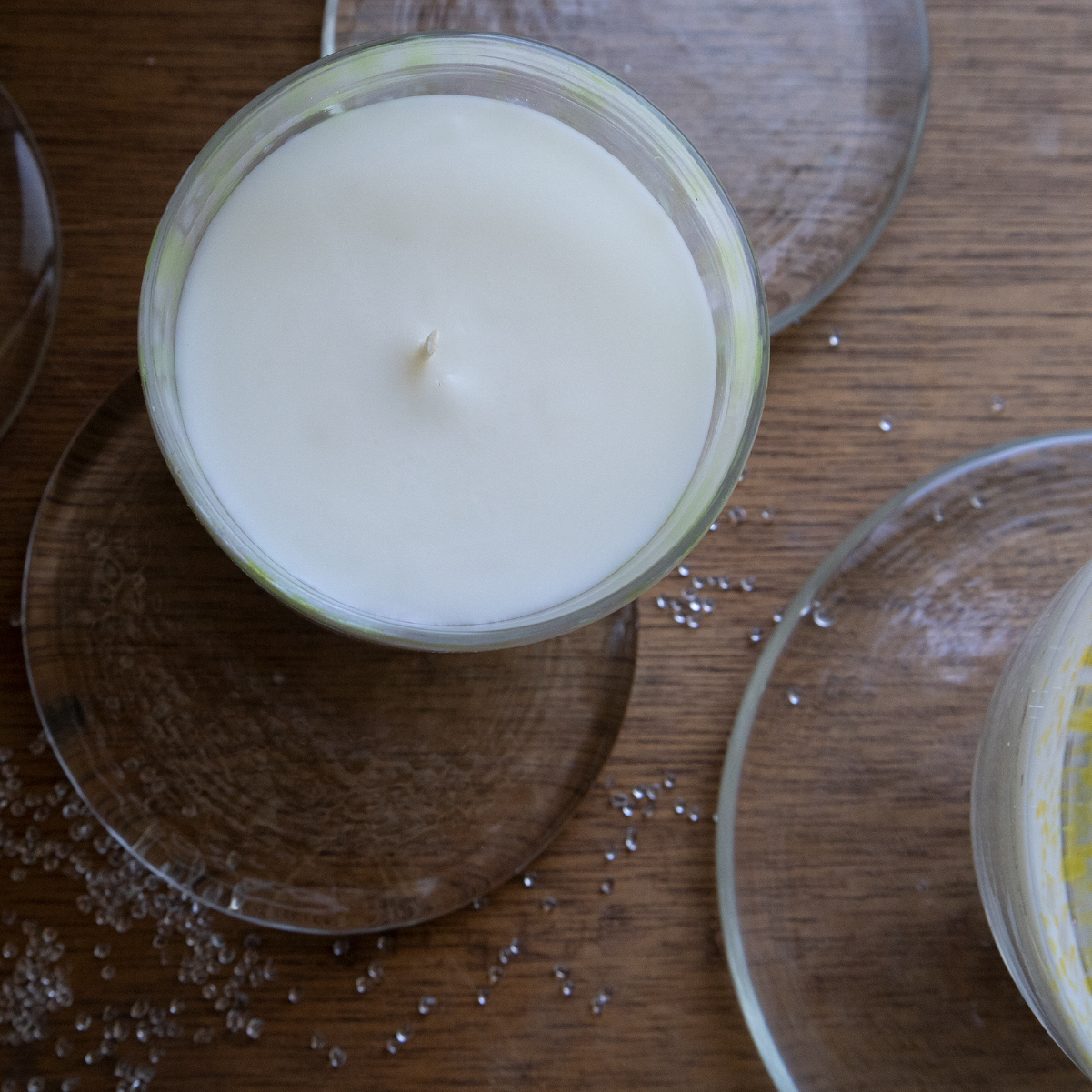 春室的玻璃器皿填充屬於春室的氣味,呼應小暑節氣選用木質香調,未來將配合每個時節訂製不同時令的香氛,讓空間氛圍多了份承載時間的味道。玻璃蓋可做為燭火熄滅使用,容器使用完後也能作為一般桌上置物的器皿,蓋子可作為杯墊,延續物件使用的可能性。