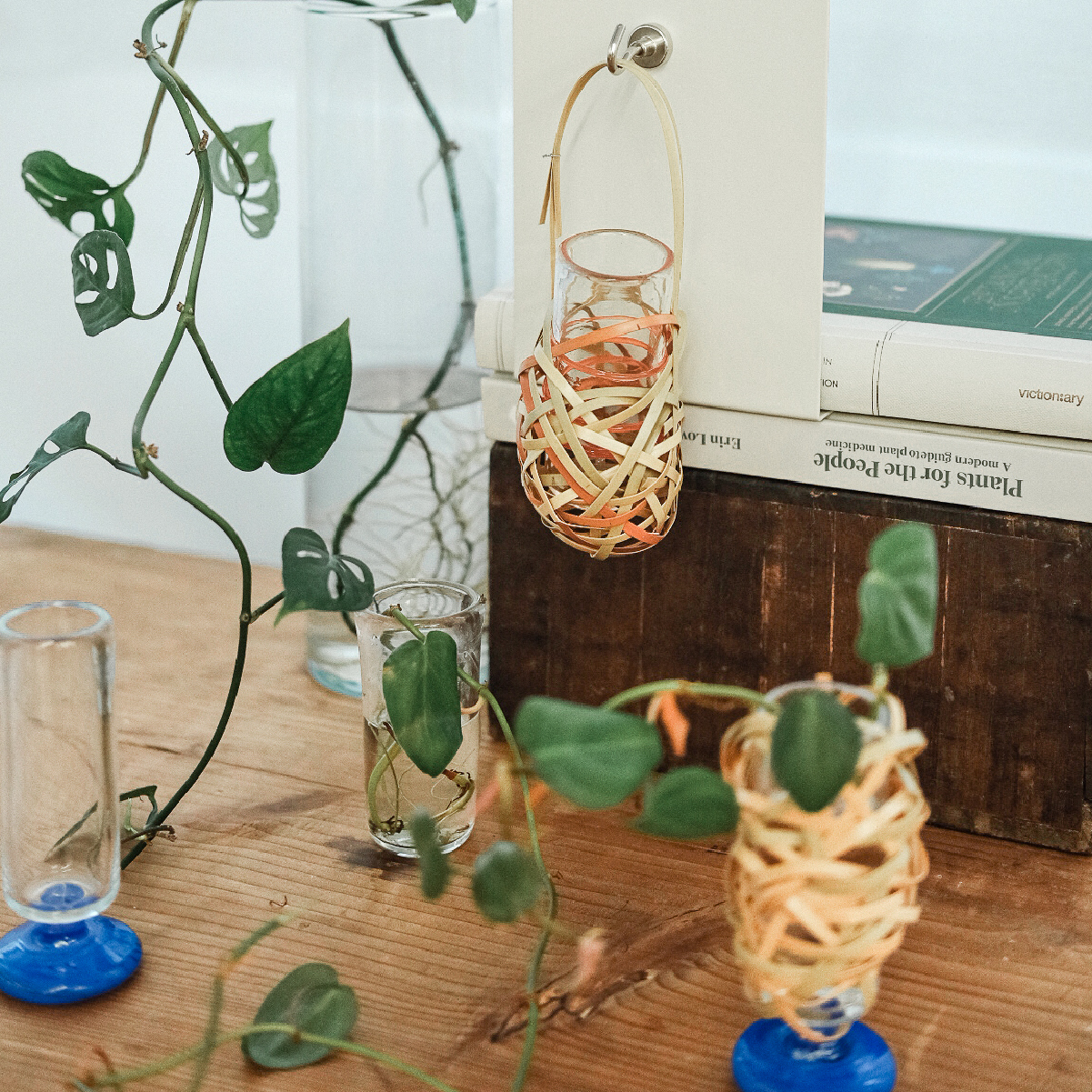 竹片自由地如海浪一般包覆在玻璃器皿,縫隙間透出晶瑩的玻璃光澤,搭配著鮮艷的彩色玻璃,增添搭配的樂趣,自由插入喜歡的植栽或花朵,安靜的放置在空間的小角落,營造屬於自己獨特的美感空間。