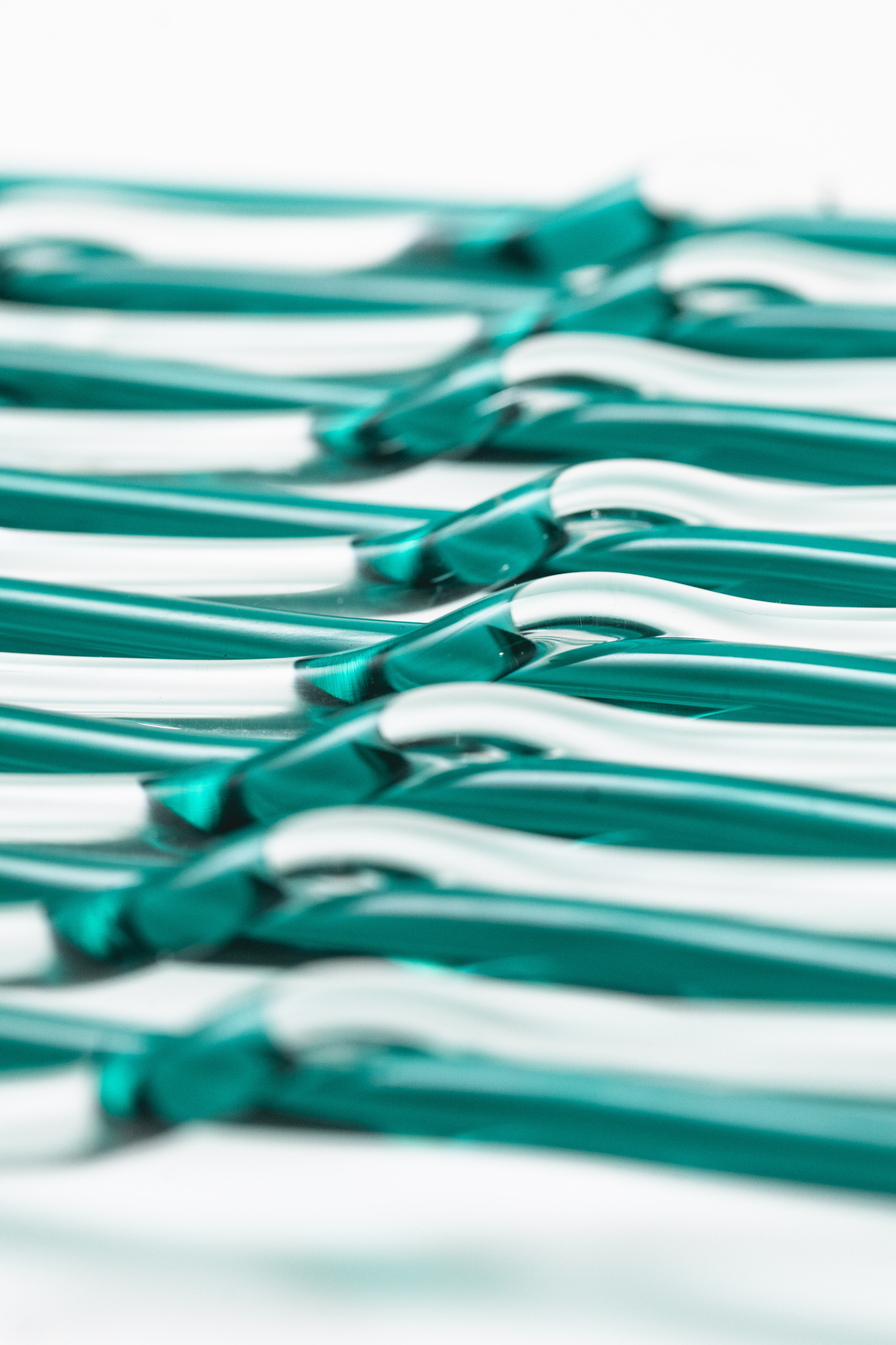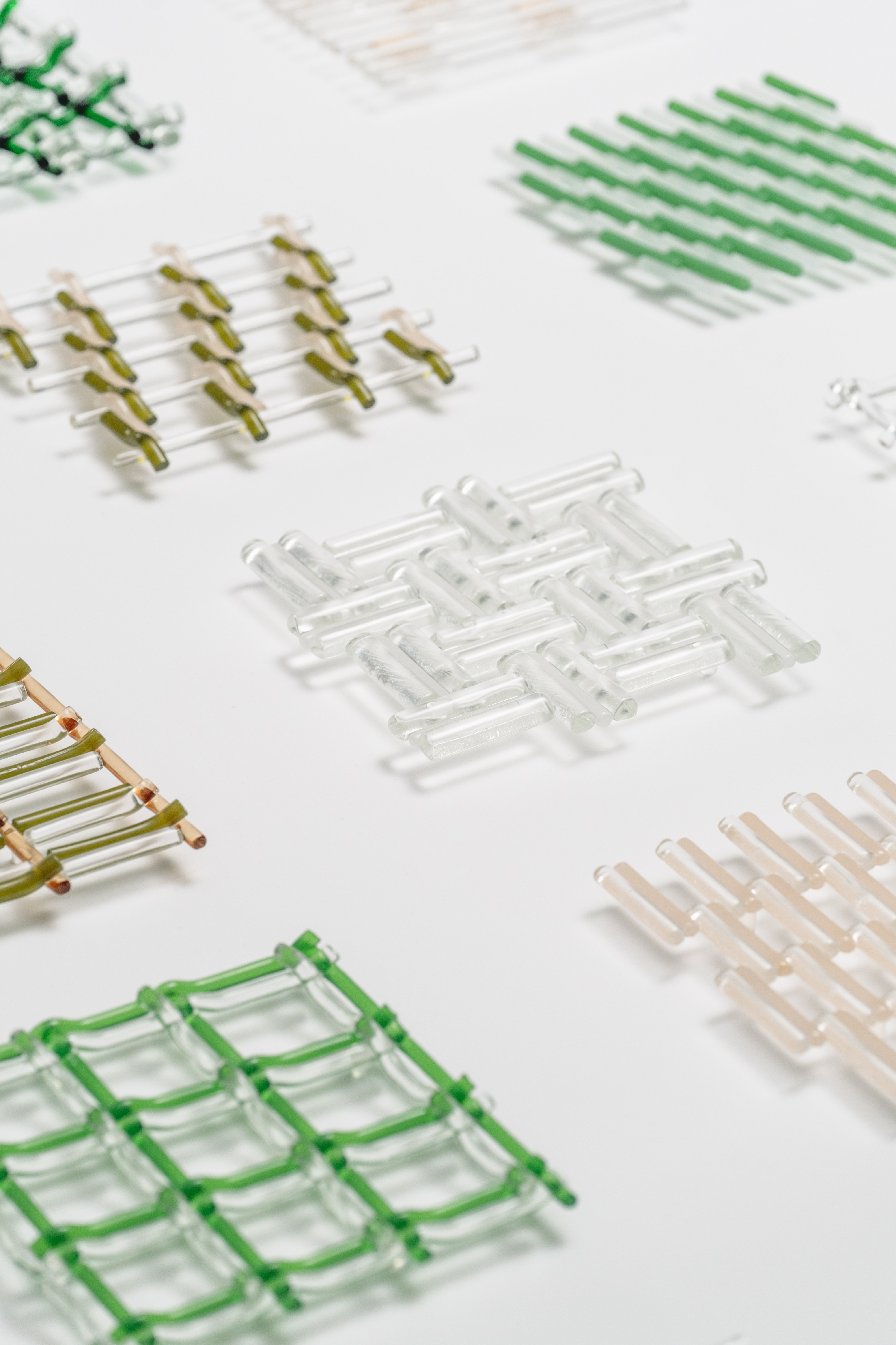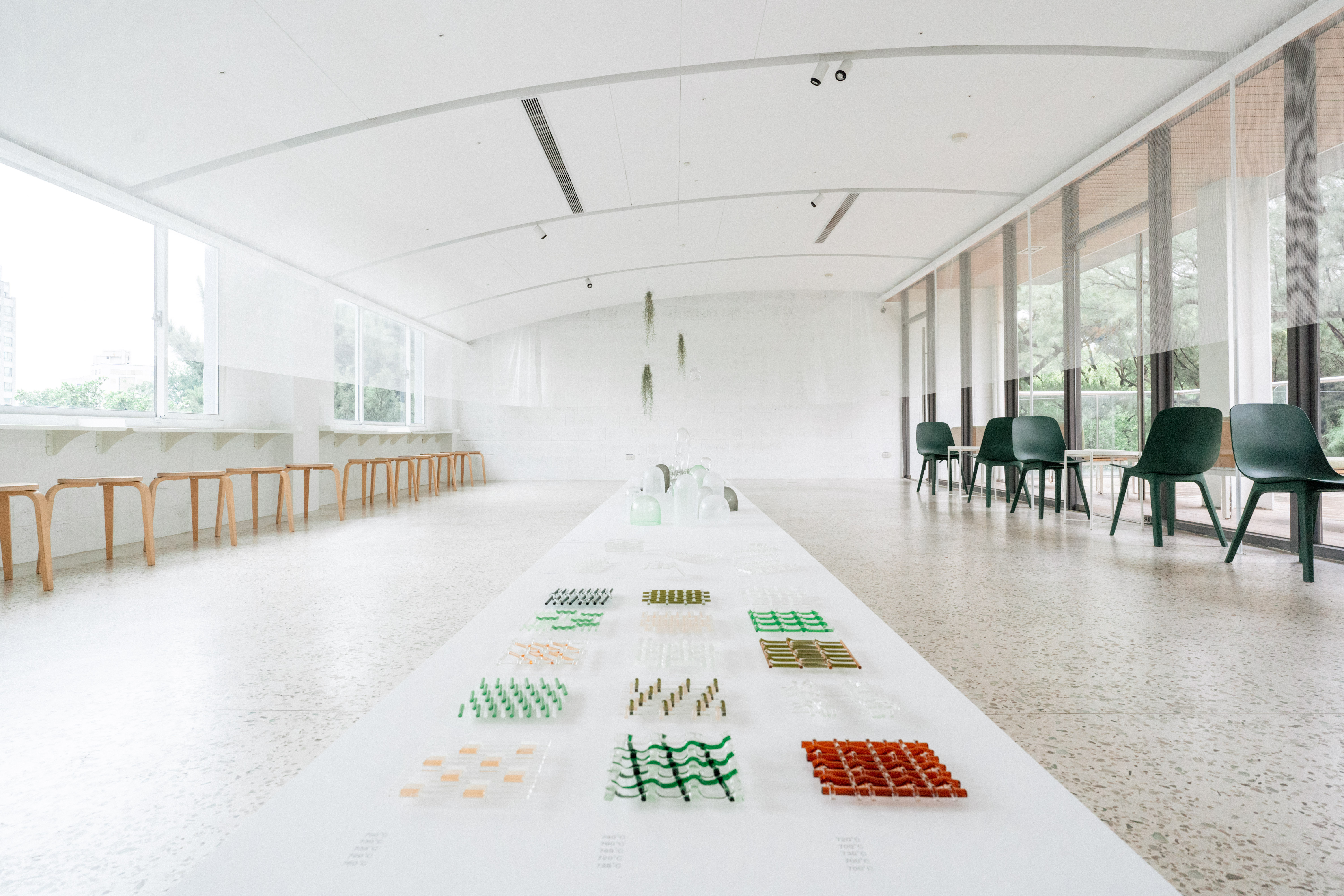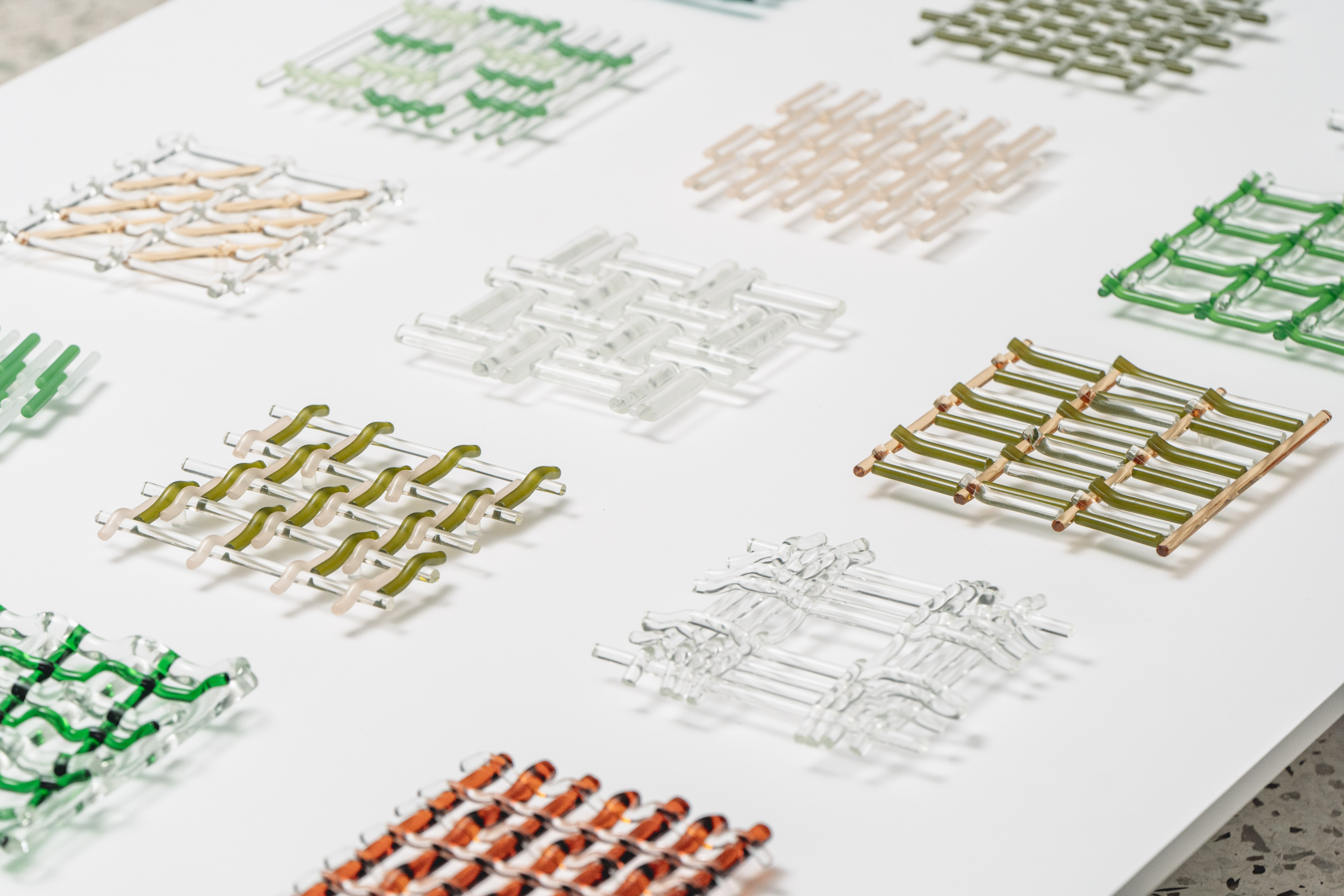 將玻璃經緯交疊,織一面溫室的網。網的細格框出溫室景物:苗色、青綠、若草,白玉、粉櫻、石蕊紅,這些色彩夾帶間隙,試圖羅列風可能流經的所有路徑。十五片平面編織在窯爐內如溫室育種,逐一實驗溫度、時間、排列方式和玻璃熔融的關係。700°C保持圓滾,760°C融化如水;有些色料經高溫氧化恍若玉色,有些透明疊合彩度折射光影。若以耐火磚為模,將編織玻璃再次烤彎,當溫火慢進,垂流重力便開始與縱橫結構相互拉扯,在抗衡之中緩緩定型——網目彎曲,受擠壓或延展,想像風正一點一點地側過身,穿過這些縫隙。