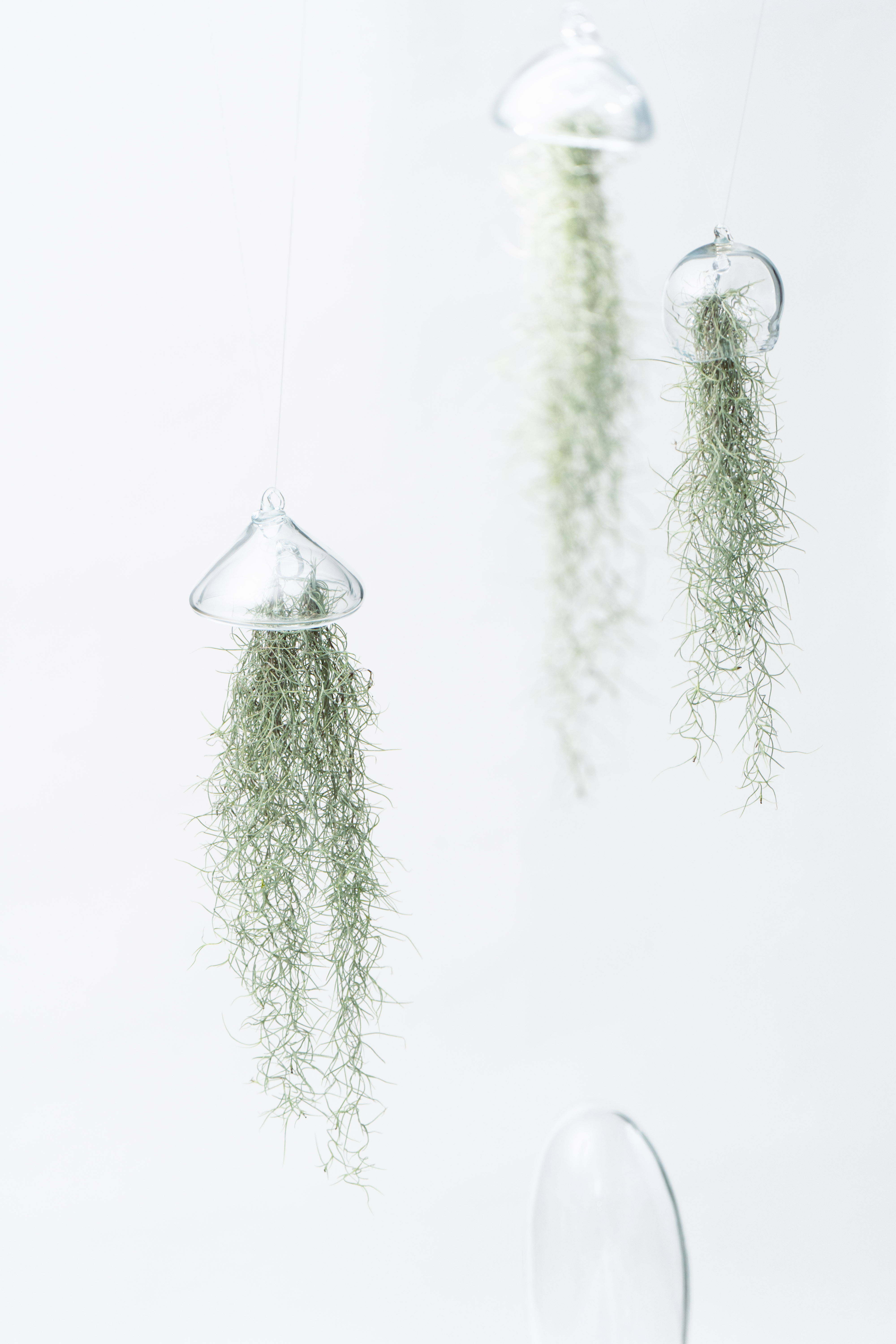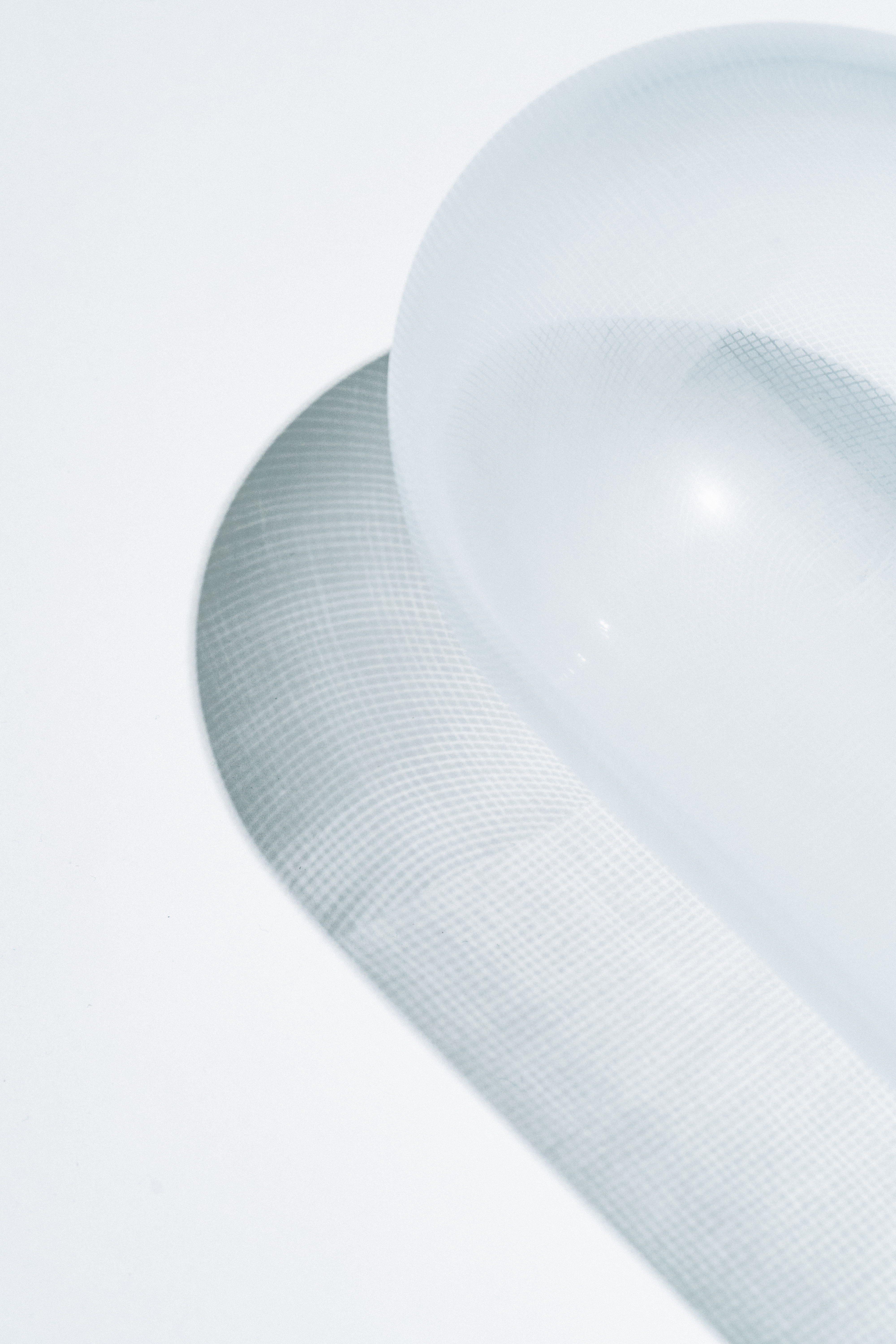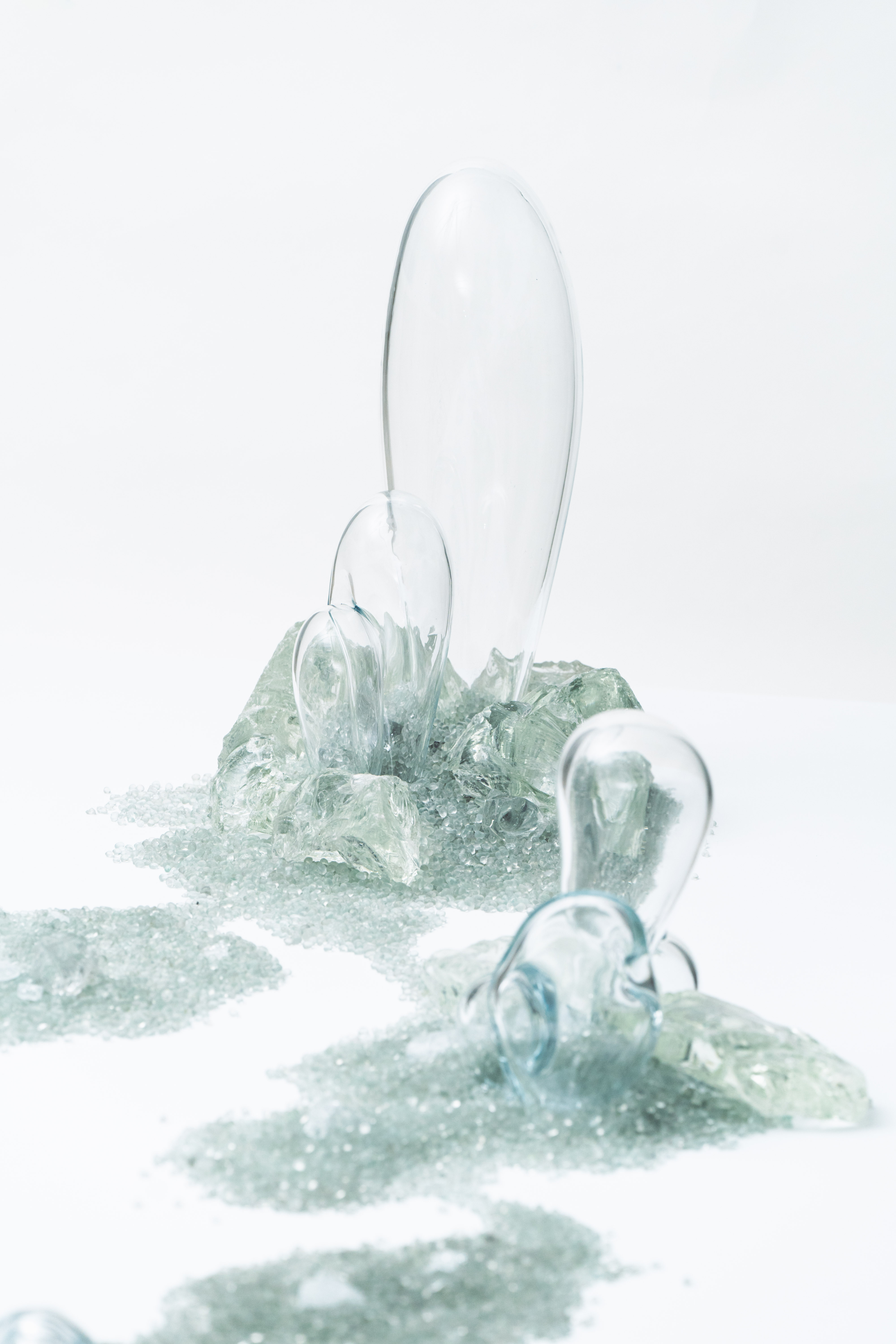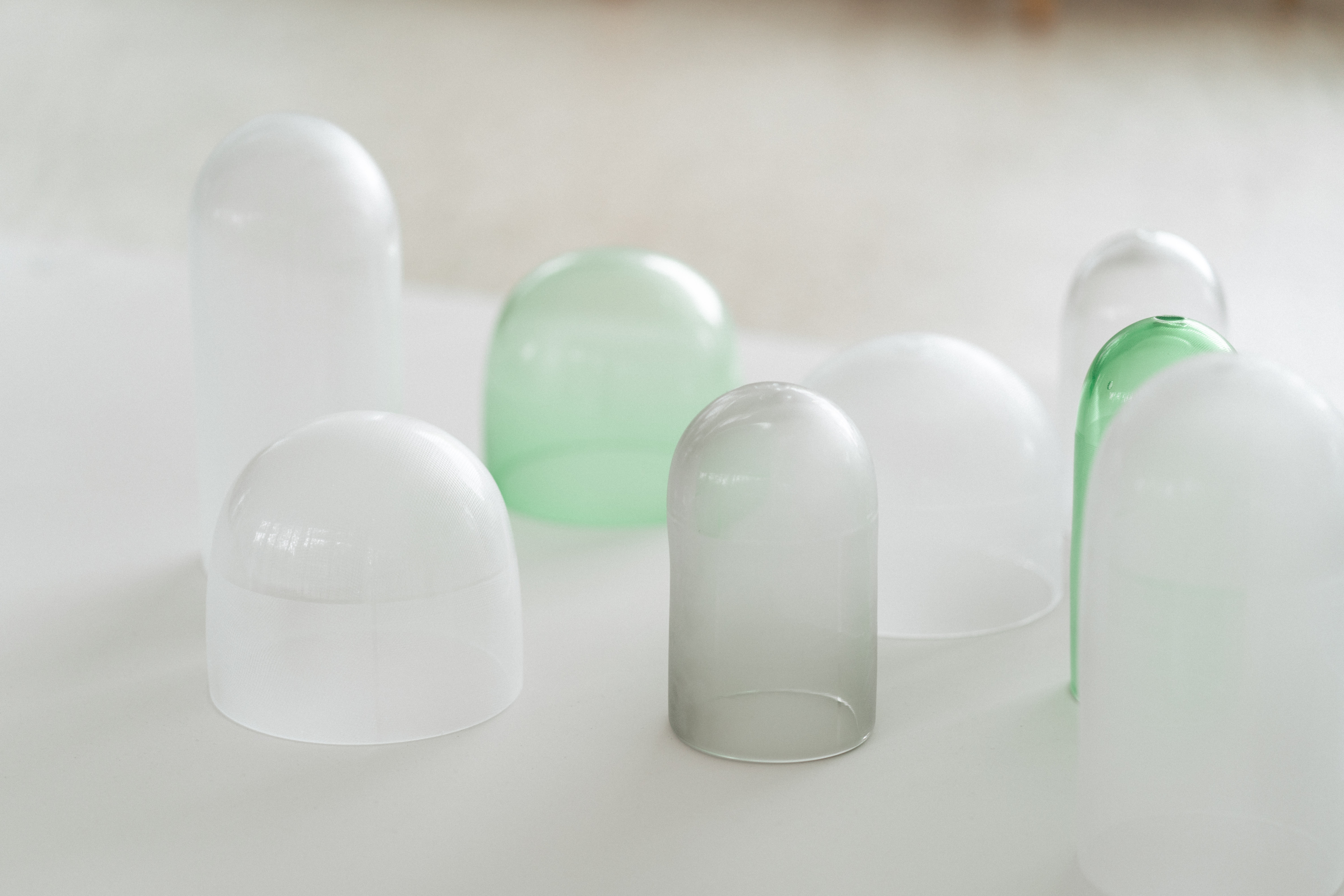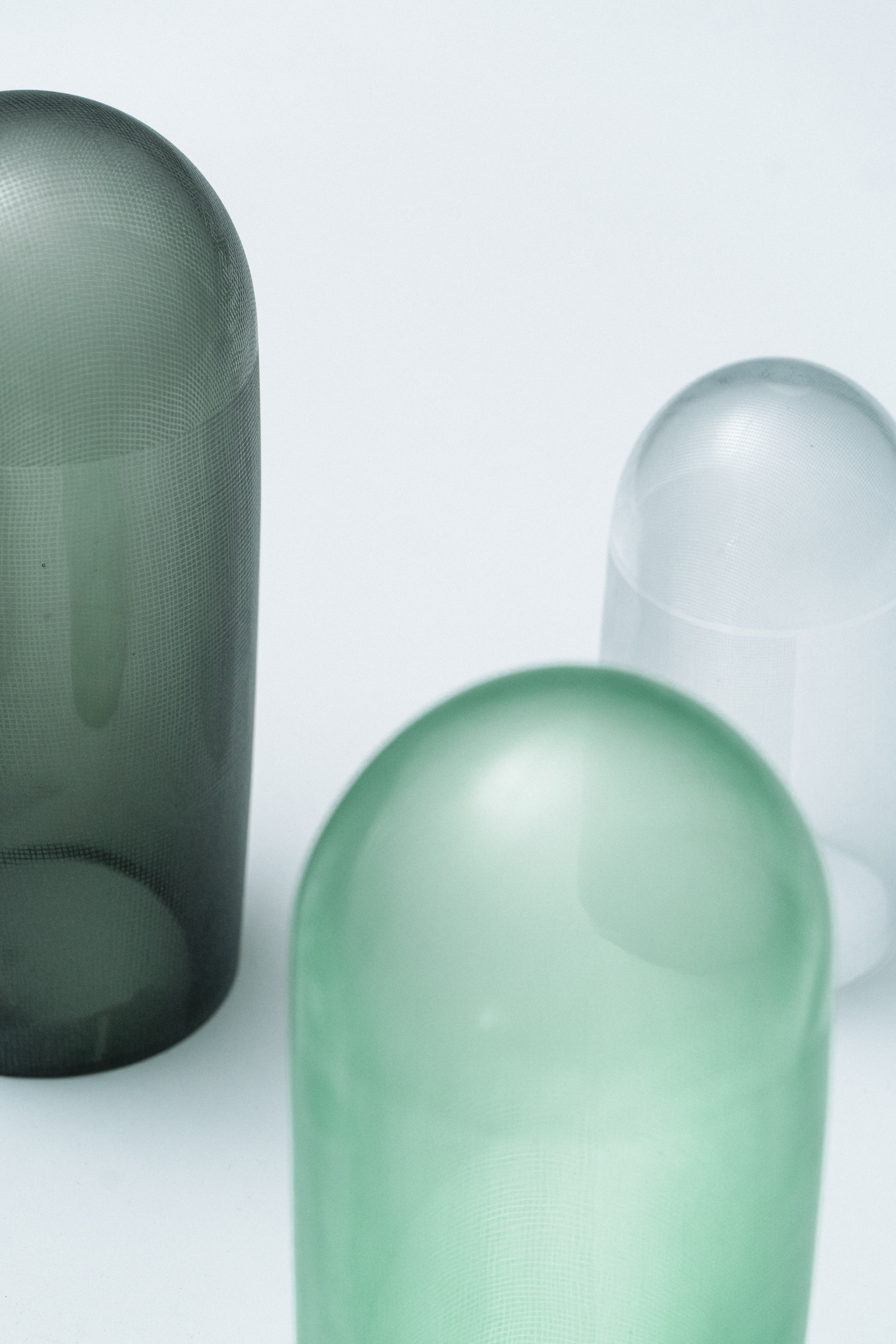 溫室的周圍皆以遮光網包覆,不同種類的網材利用編織的疏密程度來調整遮光率,以創造出最適合各種農作物生長的環境。〈shade〉試圖將遮光網產生的細微陰影融入玻璃物件中,藉由不同透光百分比的網材覆蓋玻璃圓罩,再利用噴砂加工在圓罩的表面增加編織紋路,使其在保持半透明的同時呈現溫室般的採光效果。